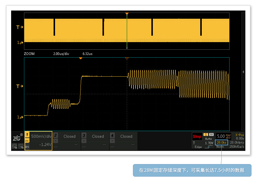 只有存儲深度足夠,示波器的采樣率才能充分發(fā)揮,觀察到的波形也更加真實、細膩。ZDS1104示波器標配28M存儲深度,您可以在1K采樣率下輕松觀測7.5小時的波形!