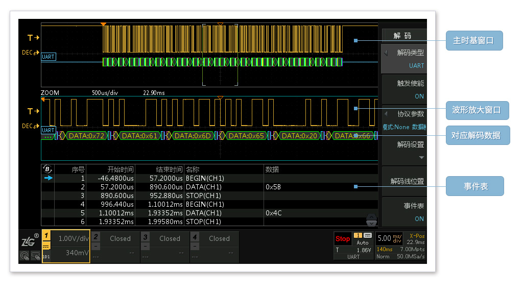 ZDS1000系列"小而美"的基礎研發(fā)型示波器海量存儲、縮放自如只有存儲深度足夠,示波器的采樣率才能充分發(fā)揮,觀察到的波形也更加真實、細膩。ZDS1104示波器標配28M存儲深度,您可以在1K采樣率下輕松觀測7.5小時的波形!協(xié)議解碼、信手拈來協(xié)議信號調試不只要關注波形質量,更要關注波形對應數(shù)據(jù),而協(xié)議解碼功能往