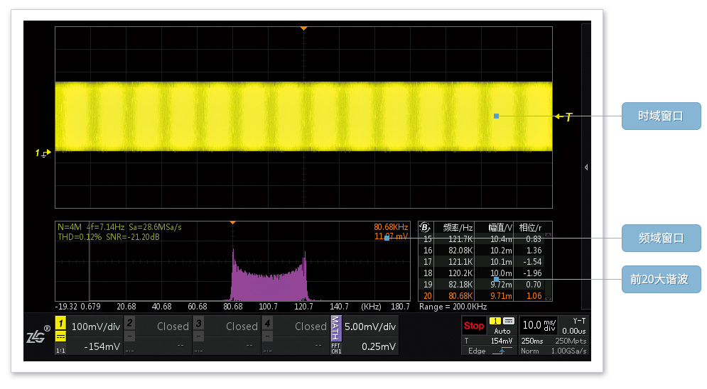 FFT功能在定位電路中的干擾噪聲來源尤為重要,但離開了充足的FFT分析頻點支持,F(xiàn)FT的分析結果往往毫無意義。ZDS1104示波器首次將基礎型示波器的FFT分析點數(shù)提升為100K,在1G采樣率的情況下,頻譜分辨率仍能精確到10KHz。