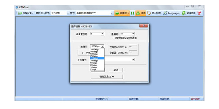 1.選擇設(shè)備波特率、通道號、工作模式啟動CAN卡