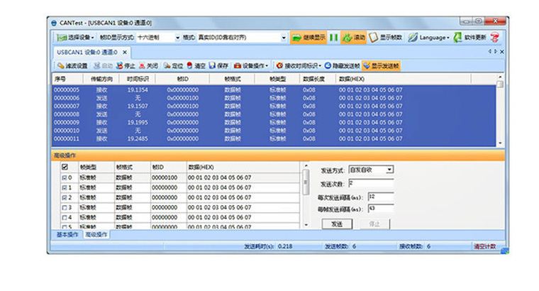 3.高級操作可預定義100幀,并且可設置發(fā)送次數(shù)與間隔