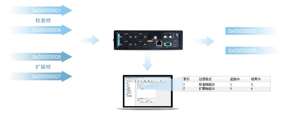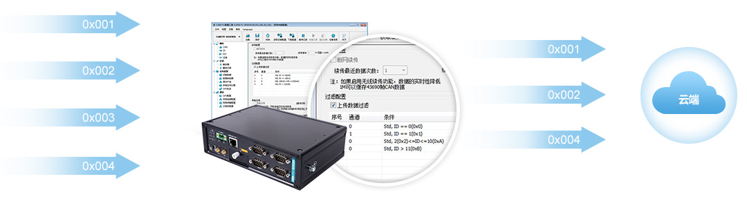 CANDTU-400EWGR設(shè)備支持網(wǎng)絡(luò)傳輸濾波功能,通過配置軟件只傳輸濾波器中的 CAN ID報文,減少不必要的網(wǎng)絡(luò)流量。
