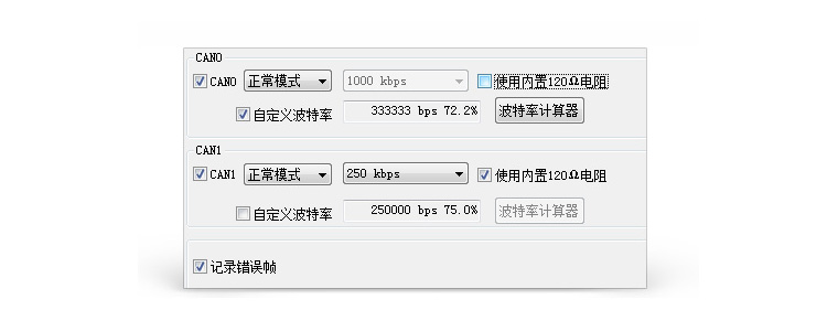 用戶可以非常方便地配置CAN接口5K~1Mbps的任意波特率,并且可以記錄錯(cuò)誤幀,軟件調(diào)整接口的120歐電阻是否使能。