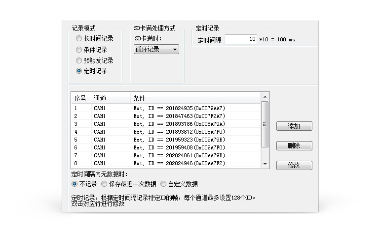 長(zhǎng)時(shí)間全部記錄會(huì)快速消耗存儲(chǔ)空間,如果多次循環(huán)記錄,則會(huì)大大減少SD卡壽命。故比較實(shí)用的是定時(shí)存儲(chǔ)。在固定周期內(nèi),只取最后一次某個(gè)ID的數(shù)據(jù)作為記錄。