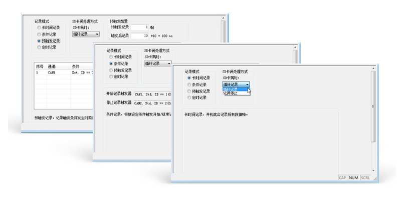 長(zhǎng)時(shí)間全部記錄中,大部分都是不關(guān)心的數(shù)據(jù),而浪費(fèi)存儲(chǔ)空間。預(yù)觸發(fā)模式可配置錯(cuò)誤幀觸發(fā)記錄,或者ID觸發(fā),并且能設(shè)置觸發(fā)前和觸發(fā)后記錄的數(shù)量。