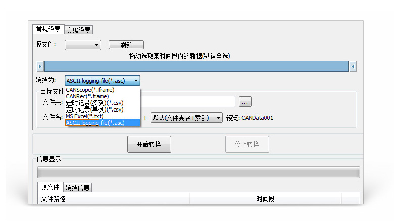 為了分析方便,CANDTU配置軟件可以將記錄的數(shù)據(jù)轉(zhuǎn)換為各種用戶常用的軟件格式,方便分析。