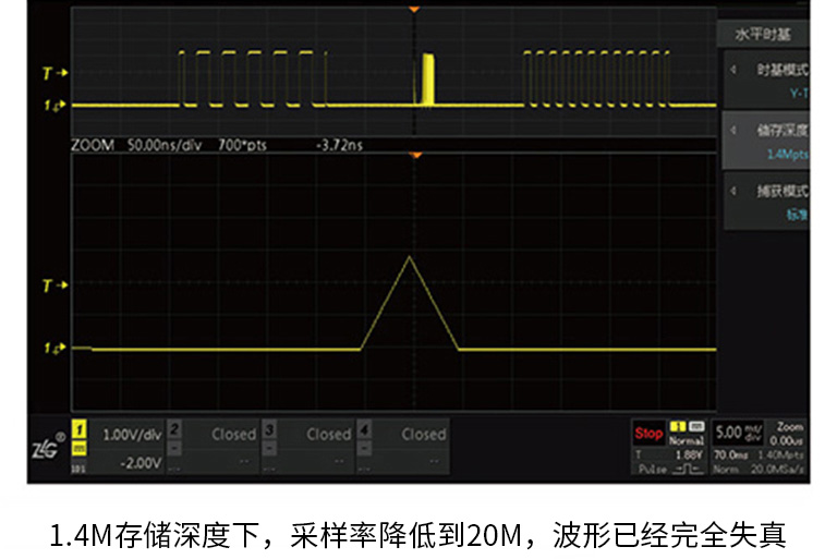 如果存儲深度能夠做到足夠大,就能保持較高的波形采樣率,則觀察到的波形會更加真實、細膩。反之,如果存儲深度只有1Mpts甚至更低,當要觀察時長較大的波形時,示波器就只能被迫降低采樣率。由于采樣點數(shù)不足,示波器顯示的波形也會嚴重失真,甚至產(chǎn)生波形混疊,誤導用戶測量分析。ZDS3000/2000B系列示波器創(chuàng)新性地采用DDR3存儲技術,配合大規(guī)模的FPGA器件,通過全硬件加速和多線程并行處理,存儲深度最高可達250M !在觀察長時間波形時也不丟失波形細節(jié)。