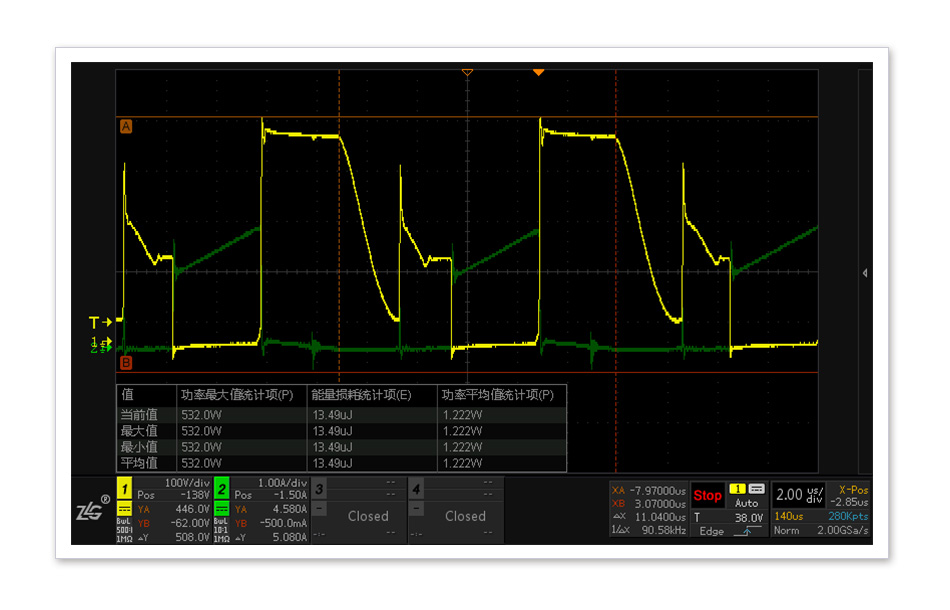PFC MOS管開關(guān)損耗測(cè)試是電源調(diào)試中的難點(diǎn),由于不同周期的電壓和電流波形都不相同,功率損耗的準(zhǔn)確評(píng)估也更依賴長時(shí)間高采樣率的波形捕獲,因此存儲(chǔ)深度和功率損耗運(yùn)算原始點(diǎn)數(shù)成為開關(guān)損耗準(zhǔn)確與否的關(guān)鍵。ZDS3024示波器標(biāo)配250M存儲(chǔ)深度,并通過全硬件加速處理優(yōu)化,可精準(zhǔn)量化開關(guān)器件的功率損耗。