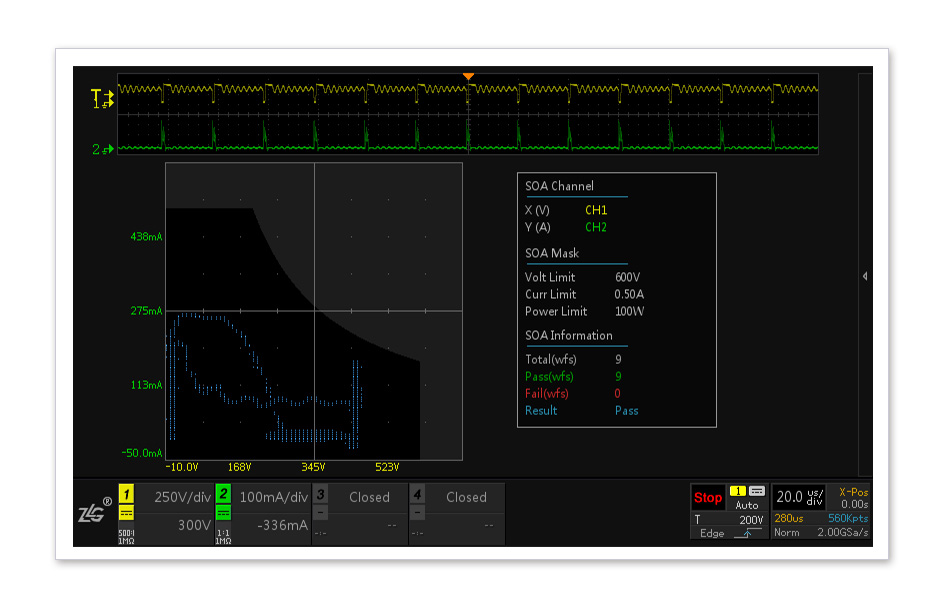 開關(guān)器件長期承受較大功耗,一但過壓或過流就可能會(huì)導(dǎo)致器件損壞甚至爆炸。雖然器件手冊(cè)中明確標(biāo)注了IDM和VDS各項(xiàng)參數(shù),但常規(guī)調(diào)試手段無法對(duì)器件的整個(gè)工作周期進(jìn)行評(píng)估。通過ZDS3024定制的SOA安全工作區(qū)測(cè)量功能,可以準(zhǔn)確評(píng)估整個(gè)工作周期內(nèi)開關(guān)器件的所有狀態(tài),明確給出電源超出安全工作區(qū)的異常概率,便于工程師更好的評(píng)估電源工作穩(wěn)定性。