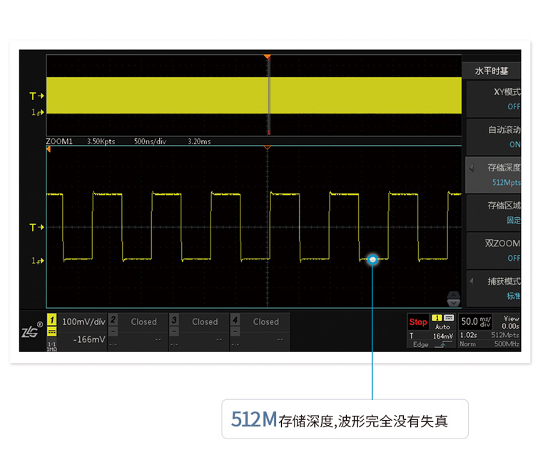存儲深度等于采樣率乘以采樣時間,512M大存儲深度,長時間捕獲波形,依然不會出現(xiàn)波形失真。