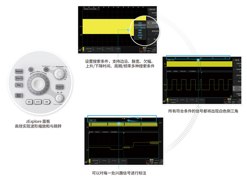 ZDS4000系列示波器不只提供了512M的波形大數(shù)據(jù),還配有強(qiáng)大的波形搜索功能和智能標(biāo)注功能。您可以先通過邊沿、脈寬、欠幅、上升/下降時間、周期/頻率等多種搜索條件來定位512Mpts波形數(shù)據(jù)中的異常點,再對找出的異常信號使用標(biāo)注功能,對異常信號進(jìn)行標(biāo)注。這里,所有的測量都是經(jīng)過FPGA全硬件加速,整個過程1S左右即可完成。再對找出的異常信號使用標(biāo)注功能,對異常信號進(jìn)行標(biāo)注。