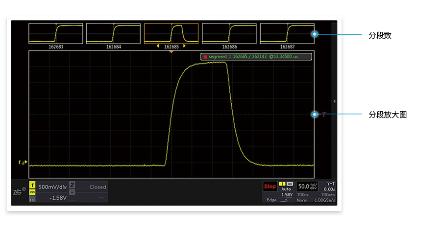 如果需要捕獲的信號是低占空比脈沖或猝發(fā)信號,并且信號之間有較長的空閑時間, 使用ZDS4000系列示波器的分段存儲功能,可以有效地延長波形采樣時間。