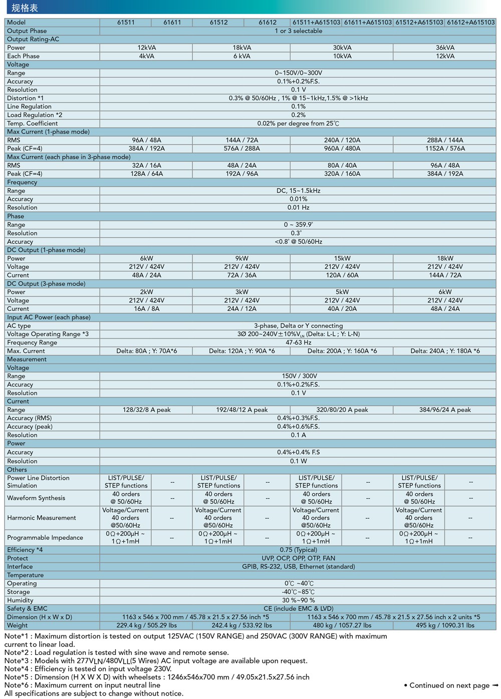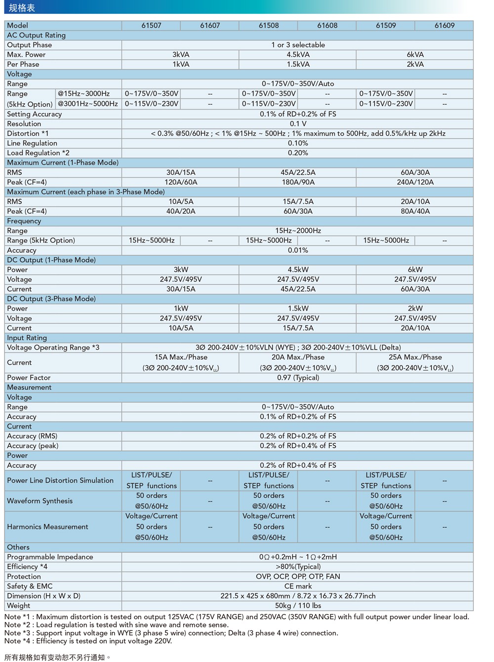 型號規(guī)格系列機種61601/ 61602/ 61603/ 61604/ 6160561607/ 61608/ 6160961611/ 61612功率規(guī)格500VA/ 1kVA/ 1.5kVA/ 2kVA/ 4kVA3kVA/ 4.5kVA/ 6kVA12kVA/ 18kVA輸出模式單相單相 或 三相單相 或 三相電壓規(guī)格0~150V/ 0~300V/ Auto0~175V/ 0~350V/ Auto0~150V/ 0~300V/ Auto頻率DC. 15Hz~1kHzDC. 15Hz~2kHzDC. 15Hz~1.5kHz并