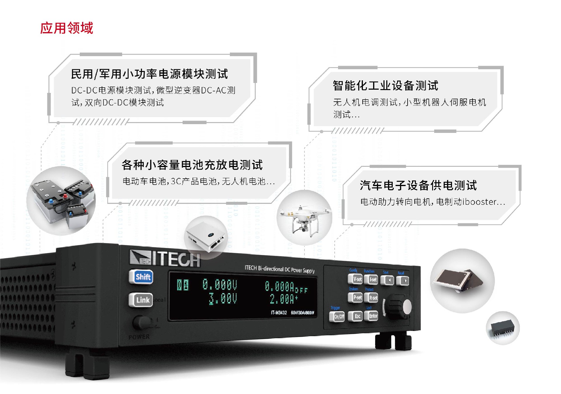 IT-M3400 雙向可編程直流電源集雙向電源和回饋式負載功能特性于一體,延續(xù)了M系列的高功率密度和模組式架構設計,可以滿足客戶的不同電流功率的測試需求。獨立的多通道設計,用戶可依據(jù)待測物的測試需求數(shù)量與規(guī)格任意配置每一個通道,滿足客制化需求。同時具備高精度的輸出和量測,并且針對測試做了多項安全設計,適合用于電源模塊、智能化工業(yè)設備、汽車電