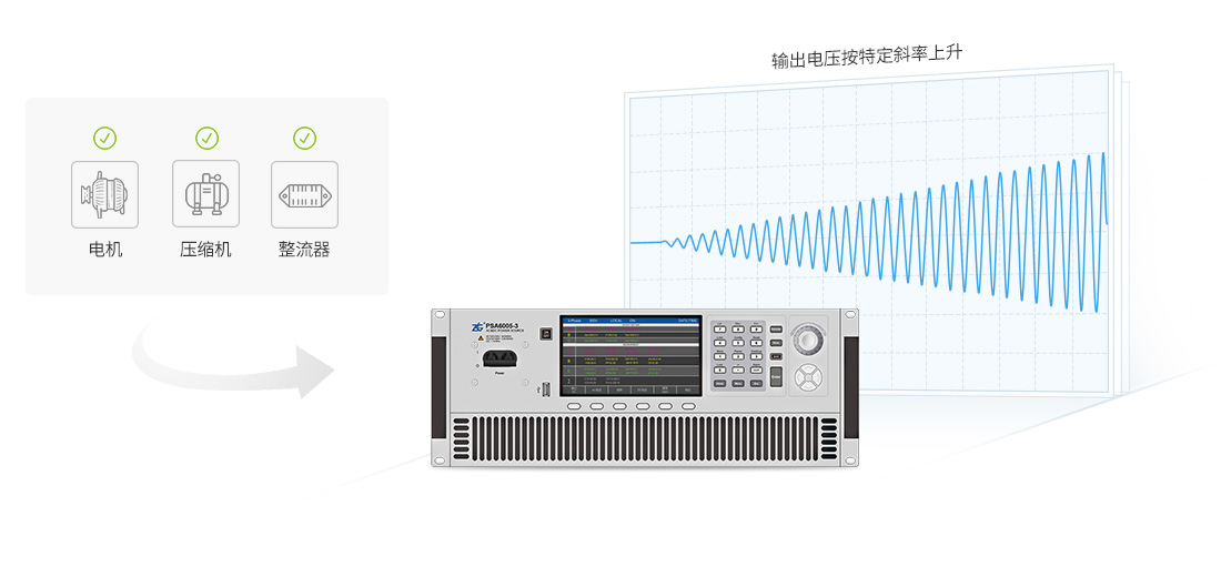 高性能可編程交流電源具備可調(diào)輸出電壓的升降斜率,同時(shí)具備高電流波峰因數(shù)(允許輸出更高的峰值電流),適用于電機(jī)、壓縮機(jī)、整流器等非線性設(shè)備相關(guān)測(cè)試。