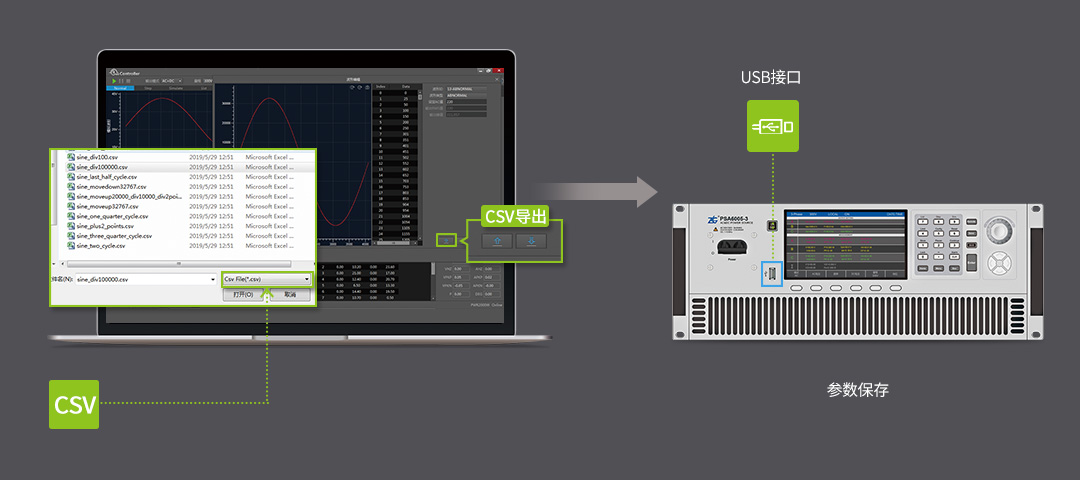 高性能可編程交流電源的前面板USB接口支持?jǐn)?shù)據(jù)導(dǎo)入導(dǎo)出,包括系統(tǒng)參數(shù)、波形庫(kù)、編程波形參數(shù)。上位機(jī)軟件支持任意波形數(shù)據(jù)導(dǎo)入,有效簡(jiǎn)化波形編輯工作。